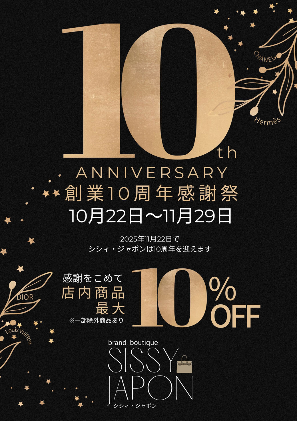 いつもSiSSY.Japonをご利用いただき、誠にありがとうございます。おかげさまで、当店は 2025年11月22日で創業10周年 を迎えます!これまで支えてくださったお客様への感謝の気持ちを込めて、10月22日(水)より創業10周年 感謝祭を開催いたします。 この10年の感謝を込めて特別価格で各種アイテムをご用意いたしました。