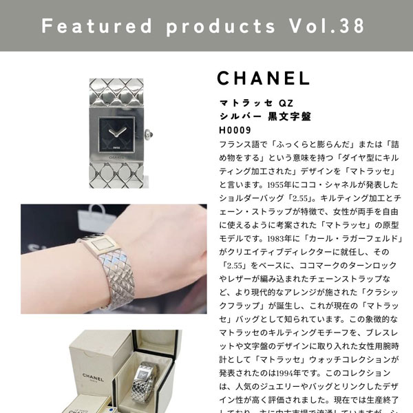 【シシィ・ジャポン マガジン Vol.103】今週の注目商品。シャネル レディース腕時計 マトラッセ QZ シルバー 黒文字盤 H0009