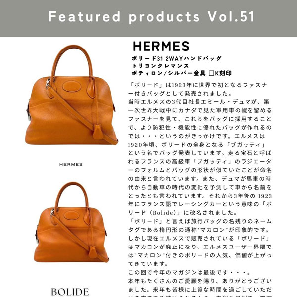 【シシィ・ジャポン マガジン Vol.116】今週の注目商品。エルメス ボリード31 トリヨン ポティロン/シルバー金具 □K刻印